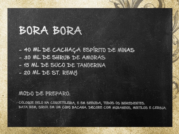Among the most traditional names in the Brazilian cocktail scene, Espírito de Minas Cachaça honors Master Derivan, of former Bar Número. The inspiration of the Master for the creation of the drink Bora Bora was youth. The moments of joy in Bora Bora Beach Ibiza, the contagious young energy of the dance floors and the fresh atmosphere of this paradise beach.